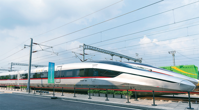 “十四五”时期,以CR450动车组为代表的一项项重大技术装备项目取得新进展、实现新突破。CR450动车组试验速度可达450公里/小时,运营速度可达400公里/小时,是全球跑得最快的高铁。图为2025年7月9日,在国家铁道试验中心展区拍摄的CR450BF动车组。